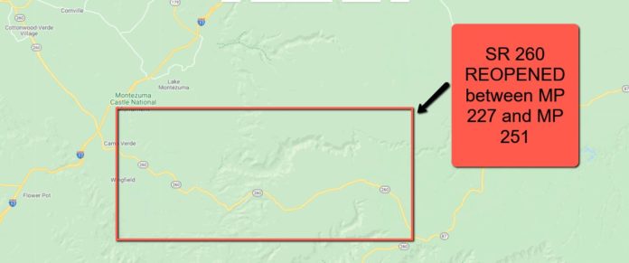 State Route 260 has reopened after it was closed by a wildfire fire between east of Camp Verde and State Route 87, according to the Arizona Department of Transportation.