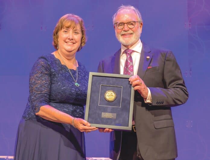 Prix de West Committee Chairwoman Susan Roeder presents the 2025 Prix de West Jackie Coles Buyers’ Choice Award to Sedona painter Curt Walters. Courtesy photos