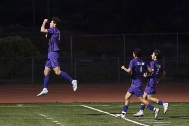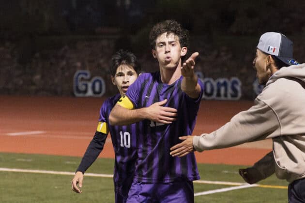 Scorpions senior Ben Metzger (no. 12) celebrates scoring the first goal of the game during the Fall Boys Soccer Semifinals game between Sedona Red Rock High School Scorpions and Blue Ridge Yellow Jackets at Sedona on Thursday, Oct. 30.