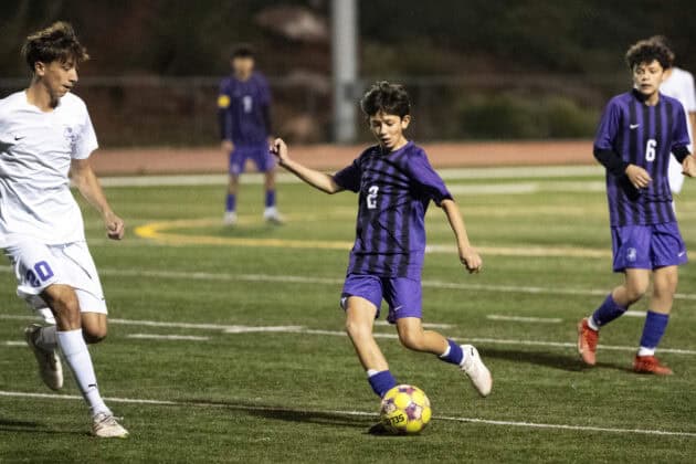 Scorpions freshman Luke Metzger (no. 2) takes control of the ball during the Fall Boys Soccer Semifinals game between Sedona Red Rock High School Scorpions and Blue Ridge Yellow Jackets at Sedona on Thursday, Oct. 30.