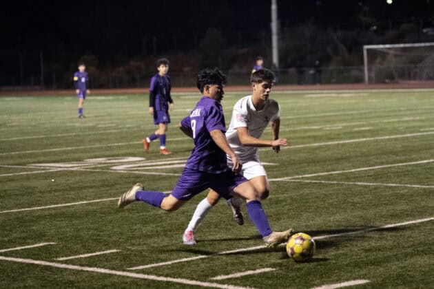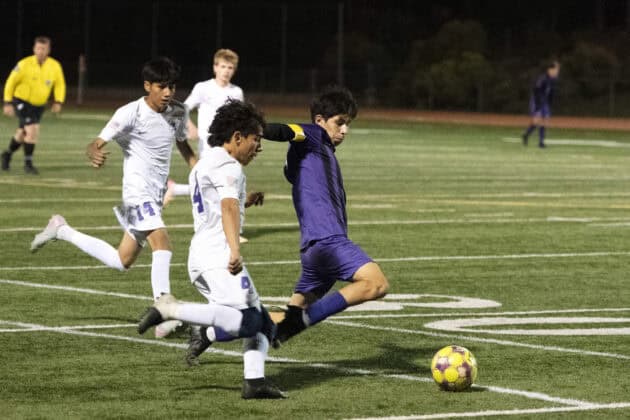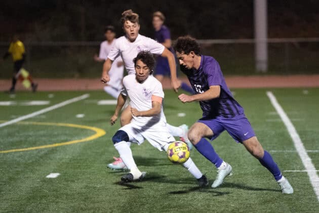 Scorpions sophomore Ariel Bustos (no. 3) fights for the ball during the Fall Boys Soccer Semifinals game between Sedona Red Rock High School Scorpions and Blue Ridge Yellow Jackets at Sedona on Thursday, Oct. 30.