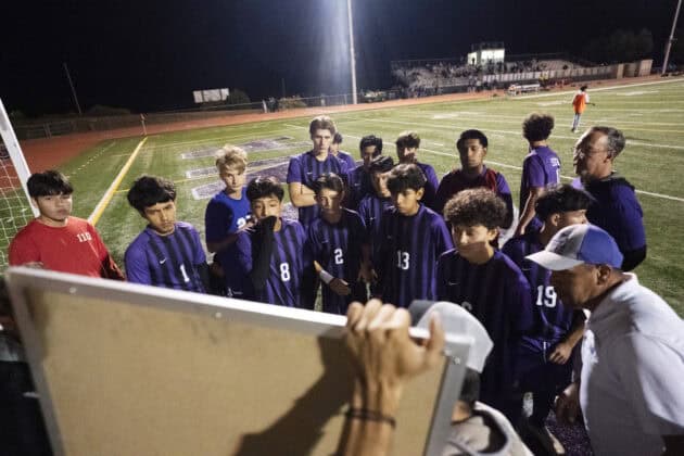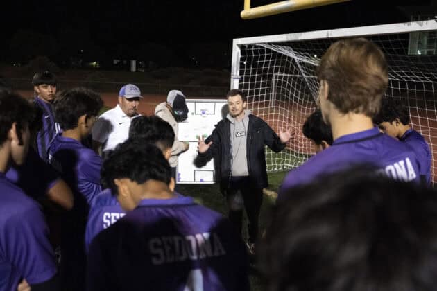 Coach Gavin Shippen speaks to the team during halftime of the Fall Boys Soccer Semifinals game between Sedona Red Rock High School Scorpions and Blue Ridge Yellow Jackets at Sedona on Thursday, Oct. 30.