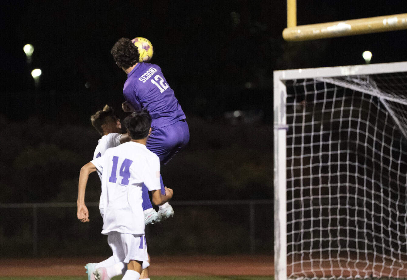 Scorpions senior Ben Metzger (no. 12) heads the ball in for his third goal of the game during the Fall Boys Soccer Semifinals game between Sedona Red Rock High School Scorpions and Blue Ridge Yellow Jackets at Sedona on Thursday, Oct. 30.