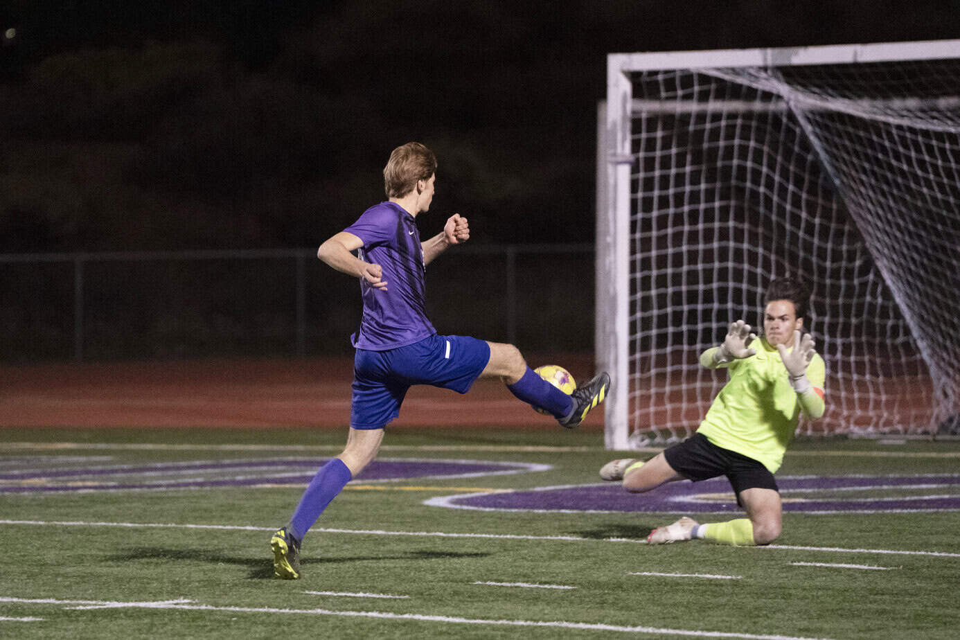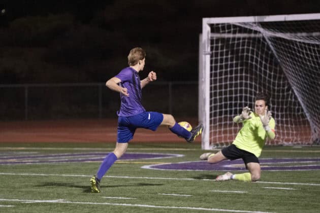 Scorpions senior Ben Metzger (no. 12) pops the ball over the Yellow Jackets goalkeeper during the Fall Boys Soccer Semifinals game between Sedona Red Rock High School Scorpions and Blue Ridge Yellow Jackets at Sedona on Thursday, Oct. 30.