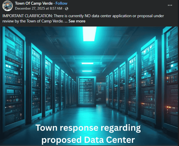 The Town of Camp Verde posted to social media on Dec. 27 that town staff had become aware of a July 29 press release published regarding BluSky AI reporting signing a letter of interest to purchase a 15-acre industrial site in Camp Verde, but that no artificial intelligence data center appears to be in the works.