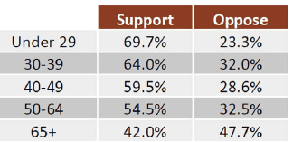 Of note is that people under 29 were most supportive at 69.7%, progressively falling to people over age 65 at 42.0%.